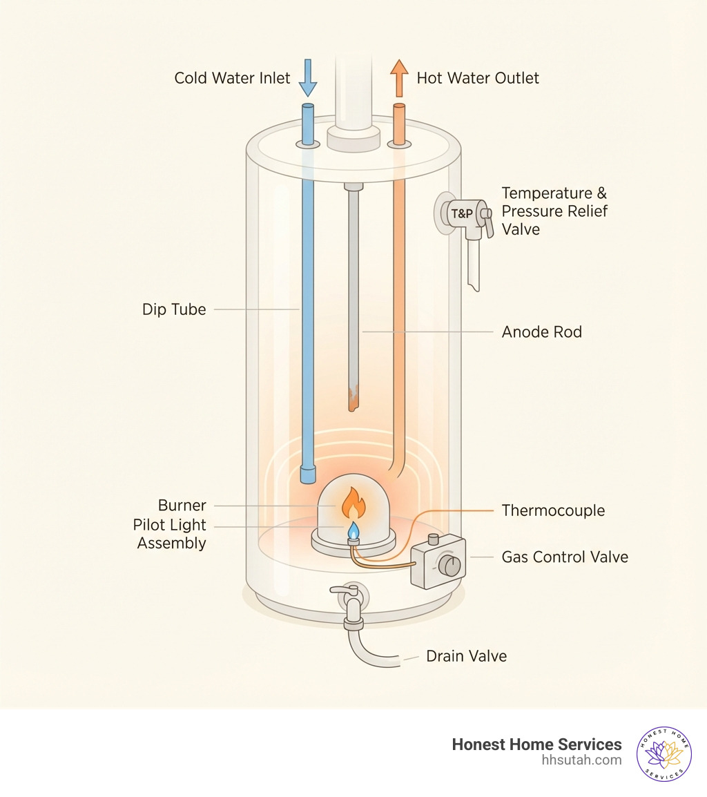 Infographic showing the main components of a gas water heater including the gas control valve, thermocouple, pilot light assembly, burner, temperature and pressure relief valve, anode rod, dip tube, drain valve, and cold water inlet with hot water outlet - gas hot water heater repair infographic